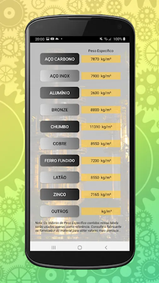 Also as a requirement the application has the Selection of the manufacturing material, which at the end of the calculations will bring information about weight, both of the circular crown arch and of the total helical structure. In the Manufacturing material selection interface, the user has reference values for the specific weight of the most common materials on the market. These values can be entered directly with just one click, or if you prefer, the user can manually enter the specific weight according to the material to be used.