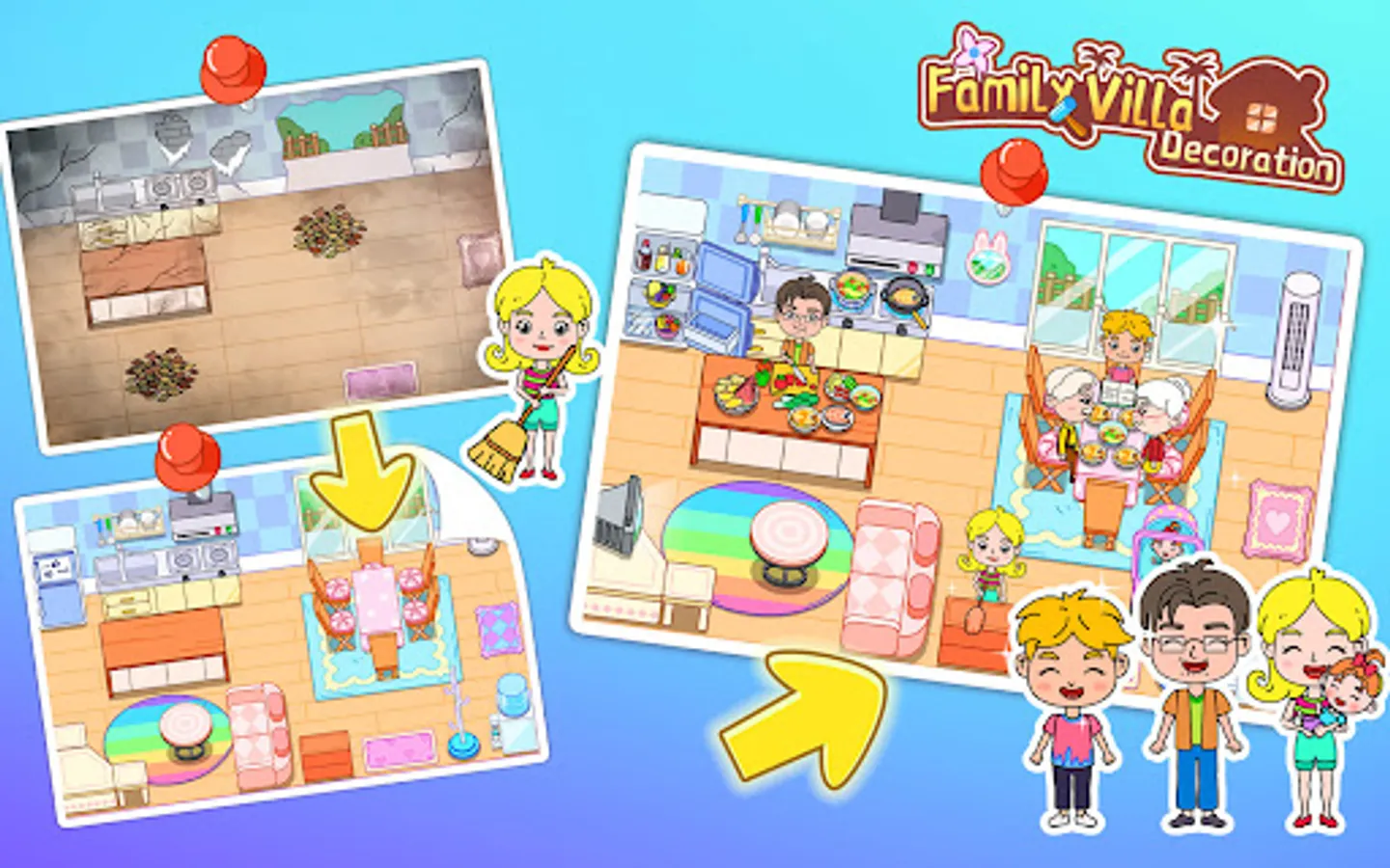 A new family has just moved to the town. They have a large home in the town, but the rooms are a little old, and they need to design and clean the house to move in. Come and join them quickly!