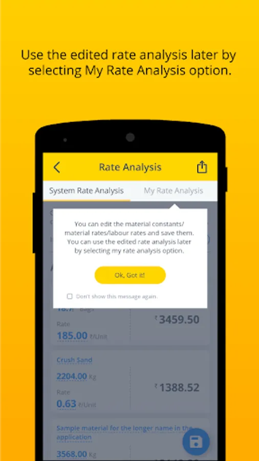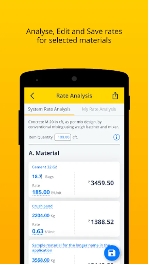 5) You can edit the material/labour names, constants and rates and save them as My rate analysis.
