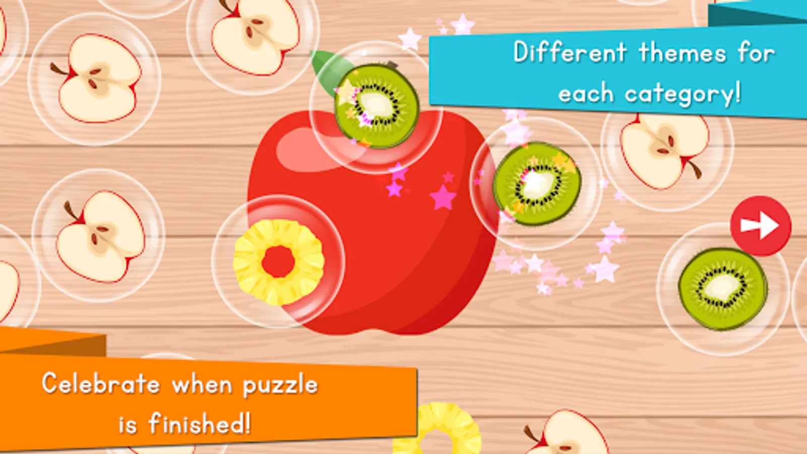 This puzzle game helps your kids develop matching, tactile and fine motor skills while playing more than 100 different Food Puzzles in 8 categories - fruits, vegetables, drinks, desserts, meals, fruits 2 and vegetables 2. The game includes animations, pronunciations of food names and interactivity for easy learning. It will teach your kids all foods and yet you will never be worried about them losing any piece of the puzzles! No more cries and missing pieces!