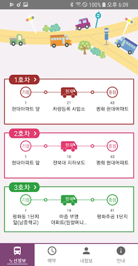 1 car (low-floor bus): starting point - in front of Hyundai Apartment / end point - Peace Hyundai Apartment