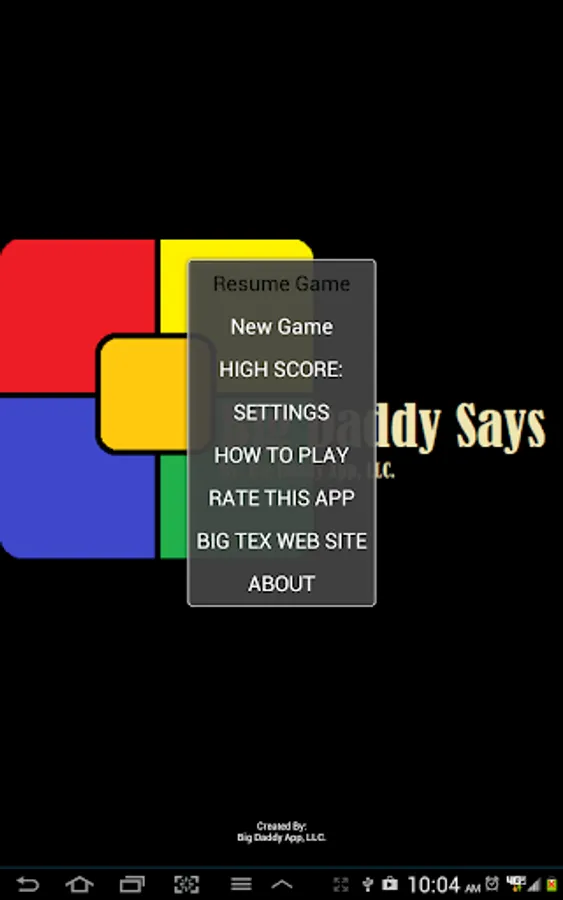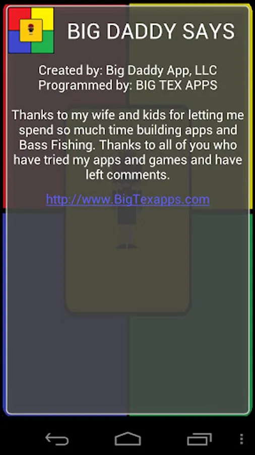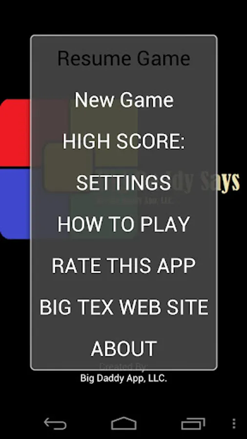 BIG DADDY SAYS is an electronic game of memory skill with FOUR and FIVE colored buttons,(with a SIX button in the works) each producing a particular tone when it is pressed or activated by the device. A round in the game consists of the device lighting up one or more buttons in a random order, after which the player must reproduce that order by pressing the buttons. As the game progresses, the number of buttons to be pressed increases.