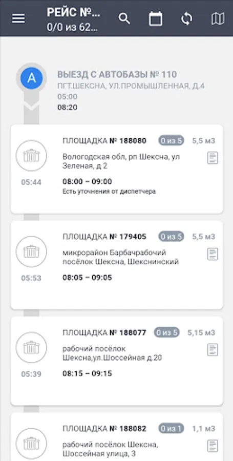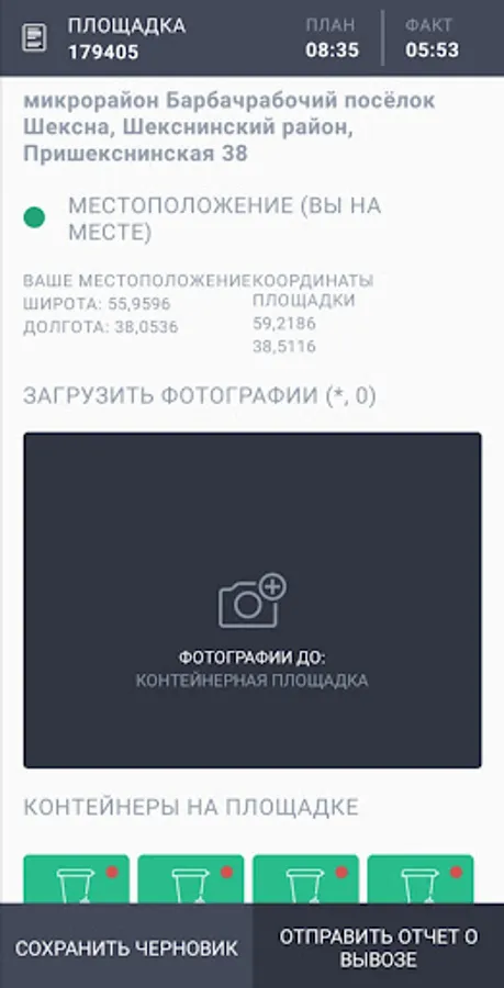 1. Driver's mobile application. With its help, the task for the day, routes are distributed, progress reports are sent. The driver takes a photo of the container before and after unloading its contents into the car. Using the mobile application, daily progress reports are automatically generated. Also, through the mobile application, communication with dispatchers is carried out.