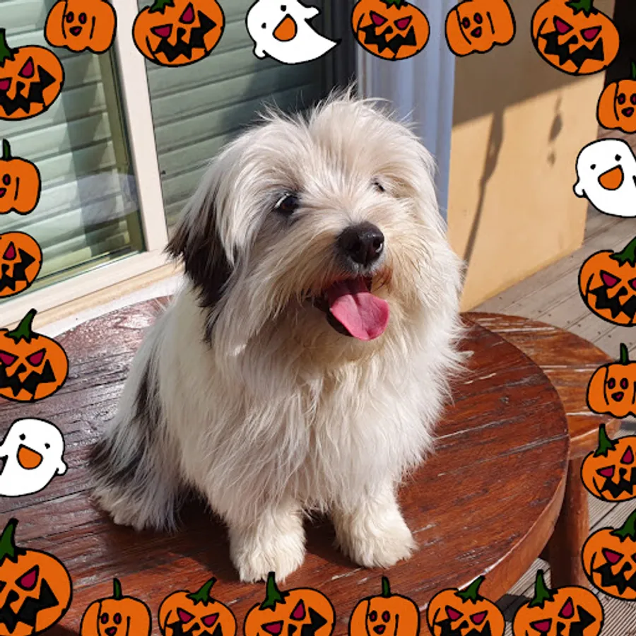 Select a photo and decorate it with a Halloween photo frame. You can also add stickers and text of your choice.