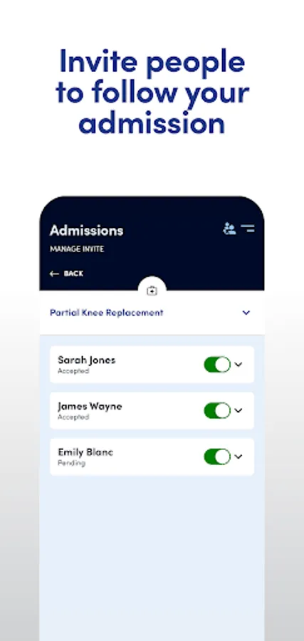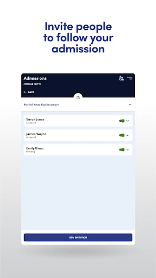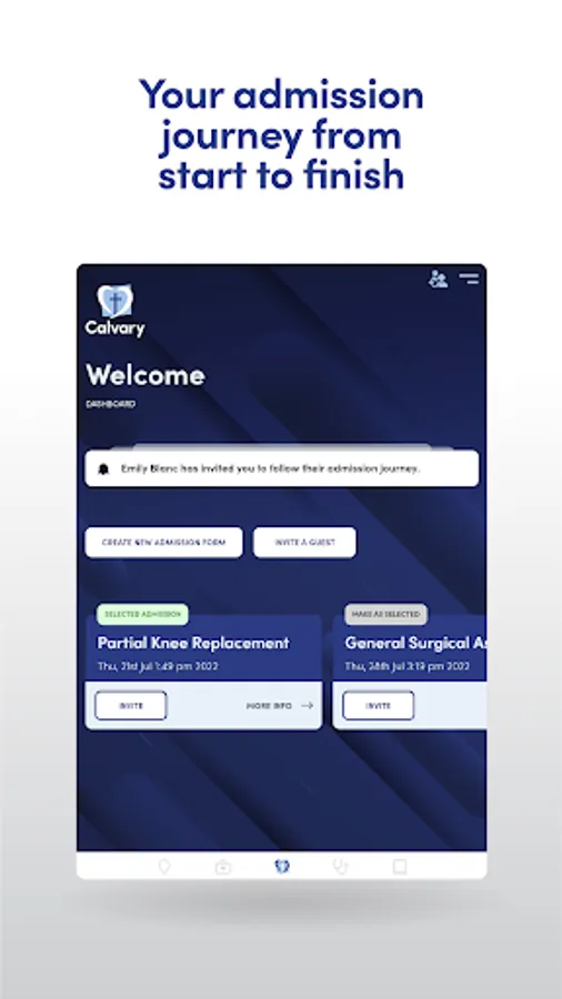 Invite people to follow your admission – Keep loved ones informed by sharing your hospital journey. They will receive updates via notifications and be able to view a progress widget.