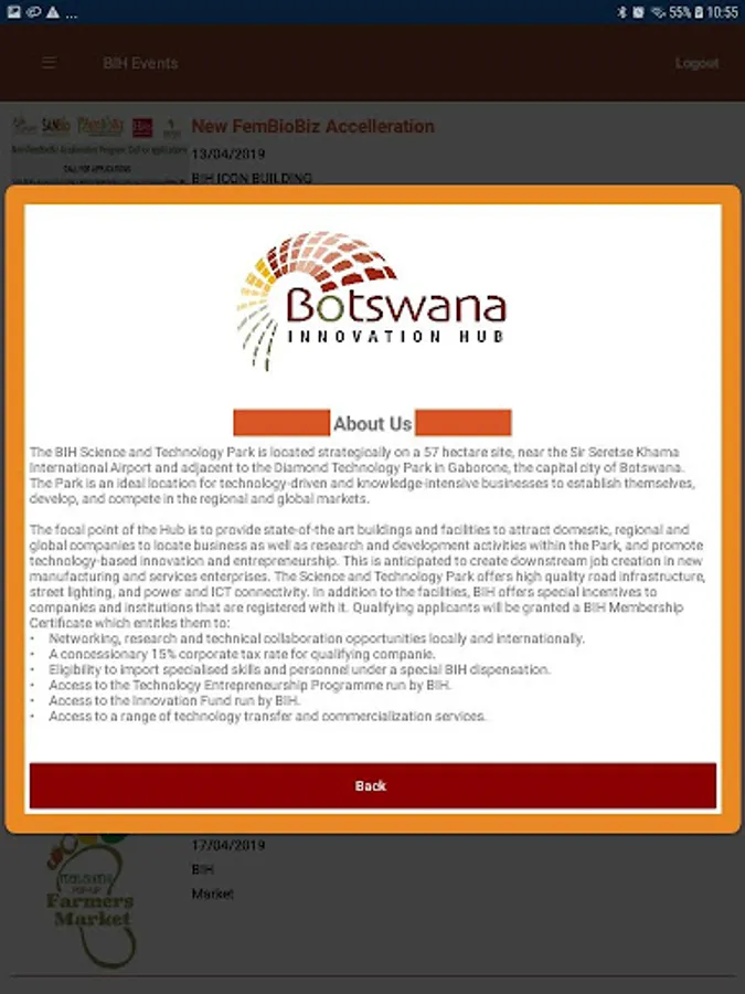 Botswana Innovation Hub events management application. The app is intended to manage and share information about all the events that BIH be coordinating.