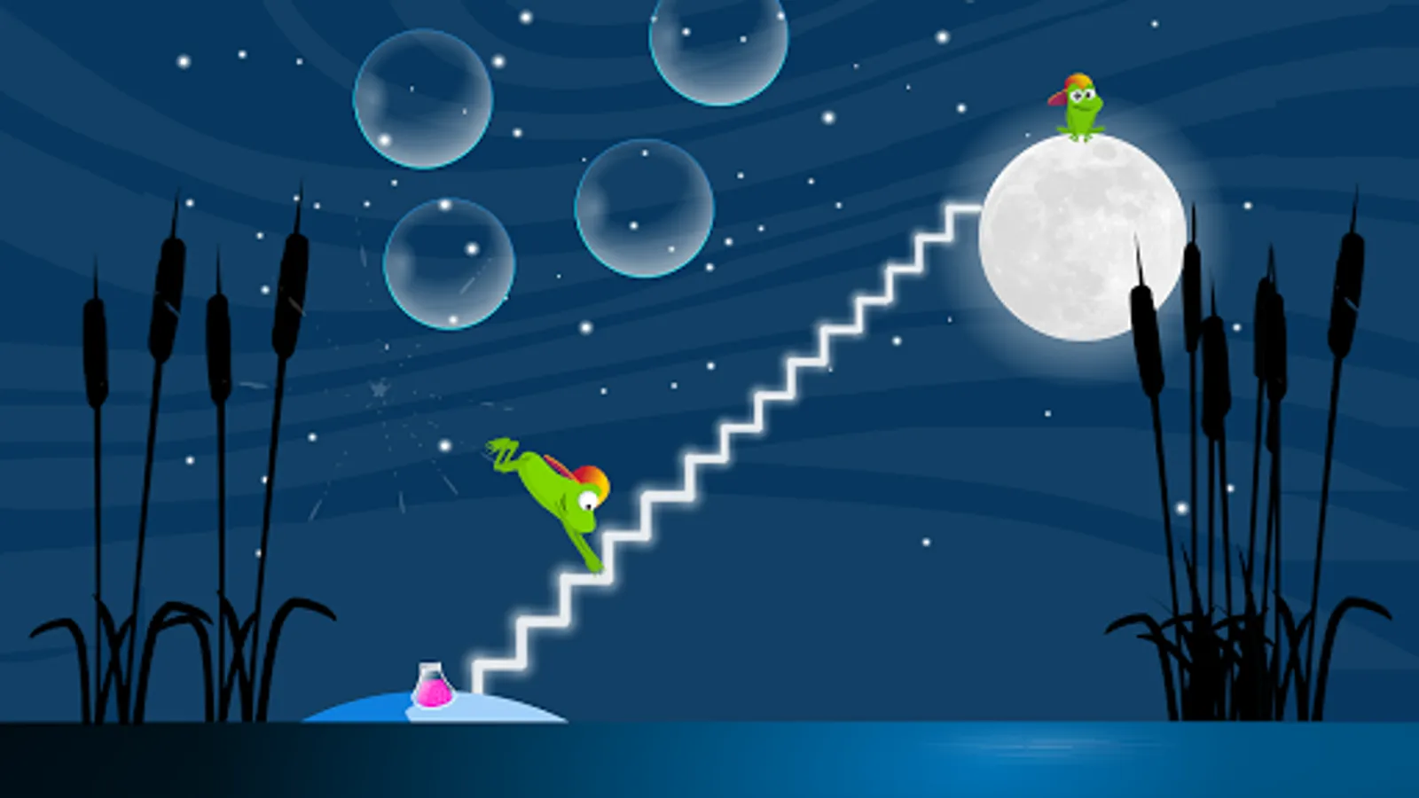 The little frog dreams about reaching the moon and he has fun blowing soap-bubbles during the night in the Magic Pond. Each bubble that bursts turns into a step of light that will eventually reach the moon.