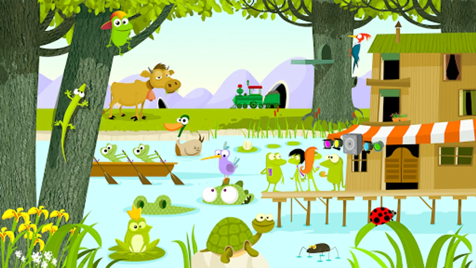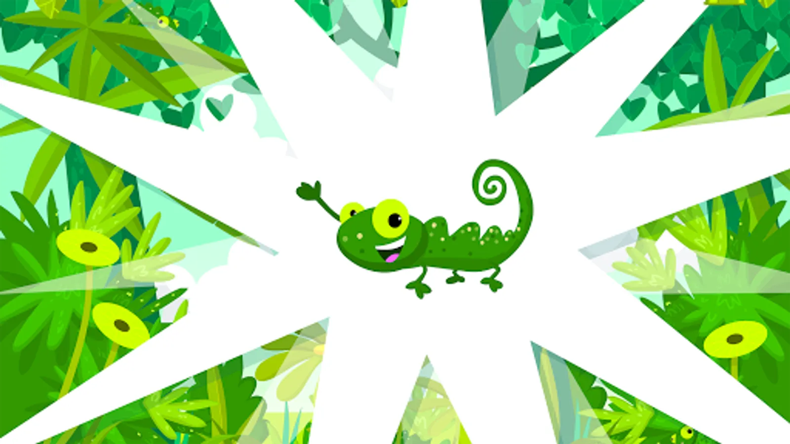 Here you find ten friendly chameleons hiding in the jungle with Caribbean music playing in the background. Sometimes the last chameleon hides so well that Mom or Dad has to help find it. (That is if they are able to.) And if no one can find it, there is no problem. You click on the little house and start over.