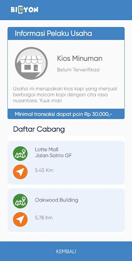 (2) Aplikasi Biiyon Merchant, aplikasi untuk para pelaku usaha UMKM mengelola platform loyalty programnya, untuk saat ini hanya dapat diunduh di Google Play (Android). Sedangkan aplikasi Biiyon untuk konsumen (Biiyon) sudah dapat diunduh di Google Play (Android) dan App Store (Apple iOS).