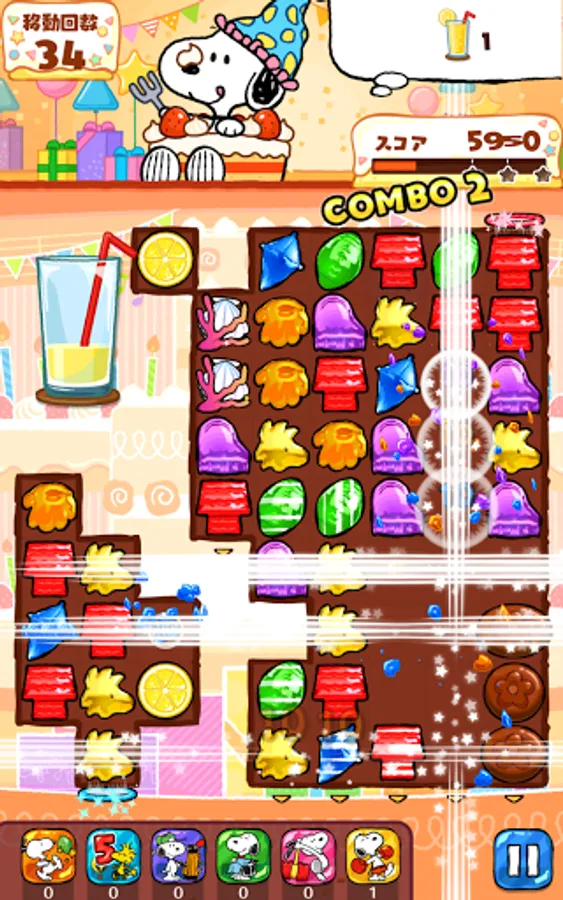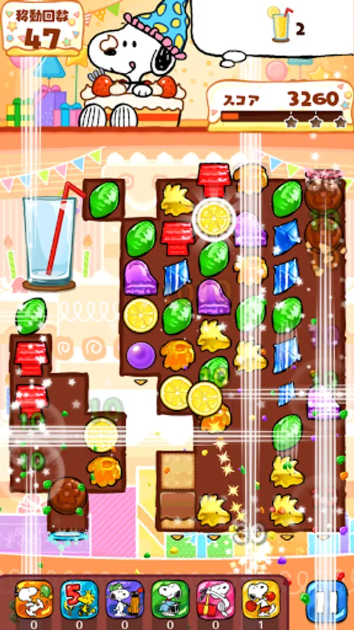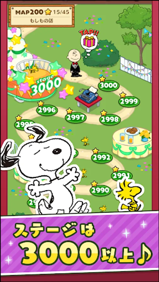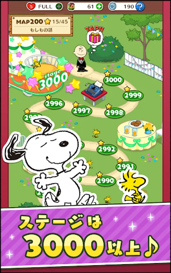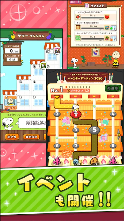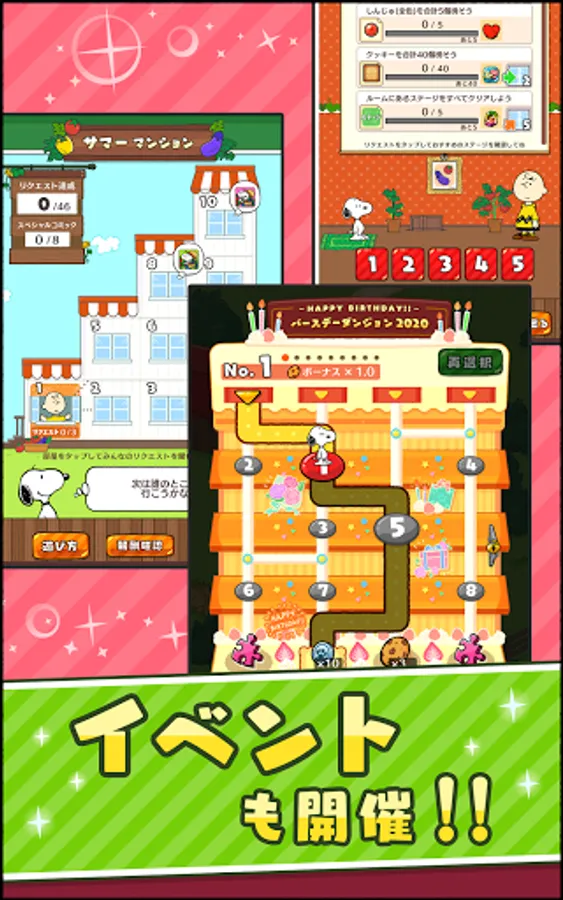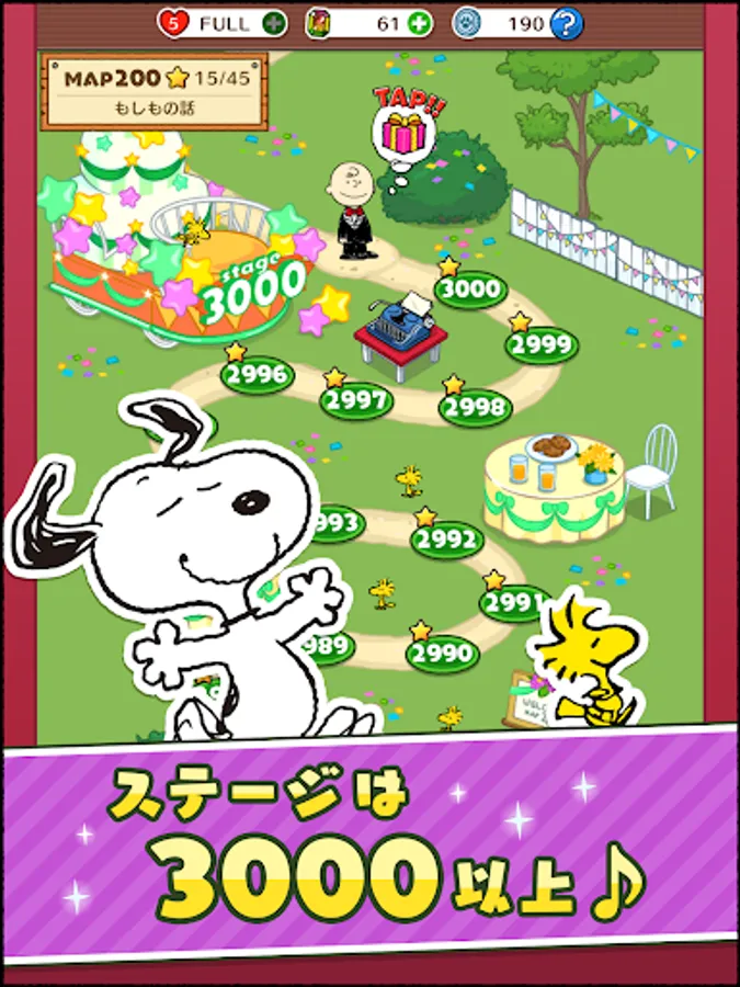 A fun puzzle game featuring the popular character "Snoopy"! Let's aim to clear with [PEANUTS] friends!