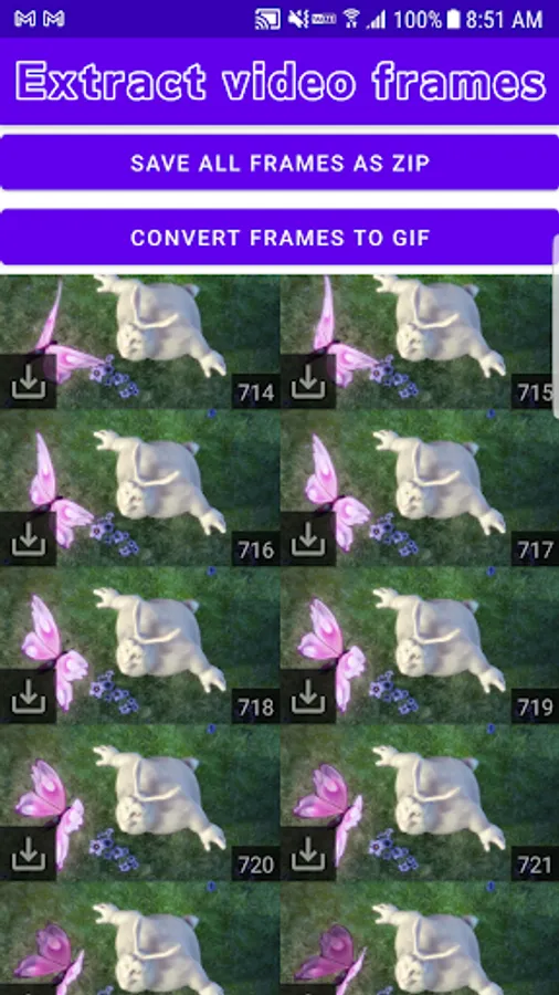 Frame images can be extracted by specifying a range of frames. Extracted frames are displayed in a list and can be saved individually or as a Zip file. You can also convert a sequence of frames into a GIF animation (some functions are available only for Premium users).