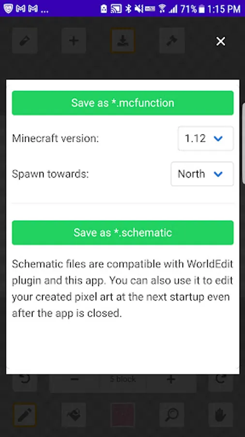 With this app, generate a behavior pack to build block art on minecraft. After then enable the behavior pack. If you want to build block art towards east (west, north or south), please type the following command in your minecraft world: