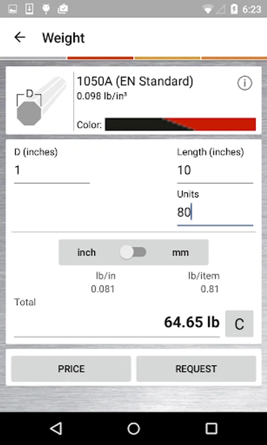 After you have calculated the weights, you can ascertain the different values using the “Price” function key. Price per kg, unit prices, price per metre (for bars, profiles and tubes), price per m² (for plates, metal sheet and pre-cuts) or the total price. The price calculator determines the missing values depending on the selection made.