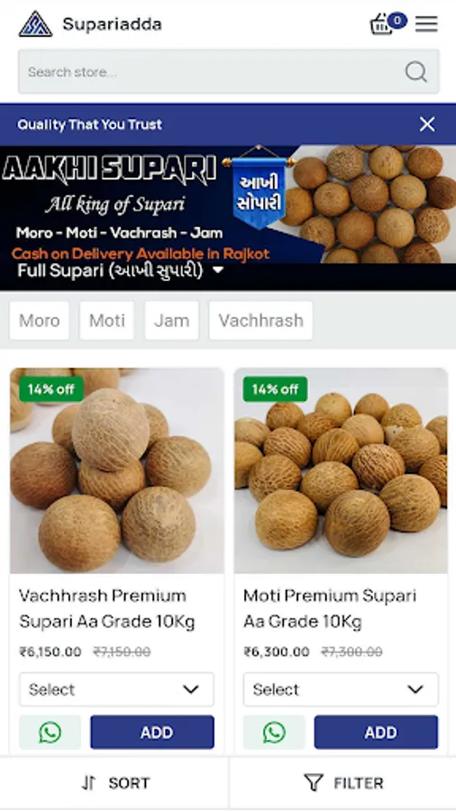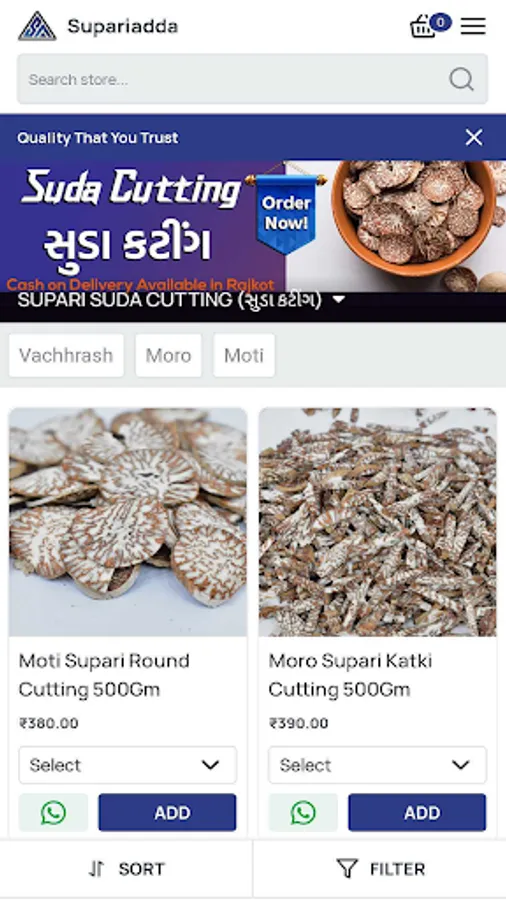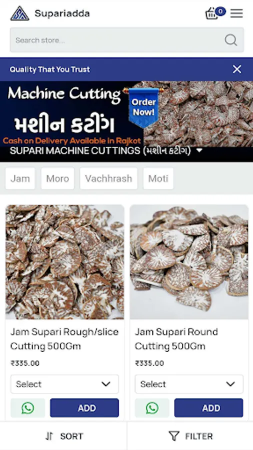 we deal in all type of supari like vahras, moti,moro, jam ext and also all type of cuttings like machine and suda cutting, and also we deal in wholesale, you can ask us for any changes in the material we will always support you