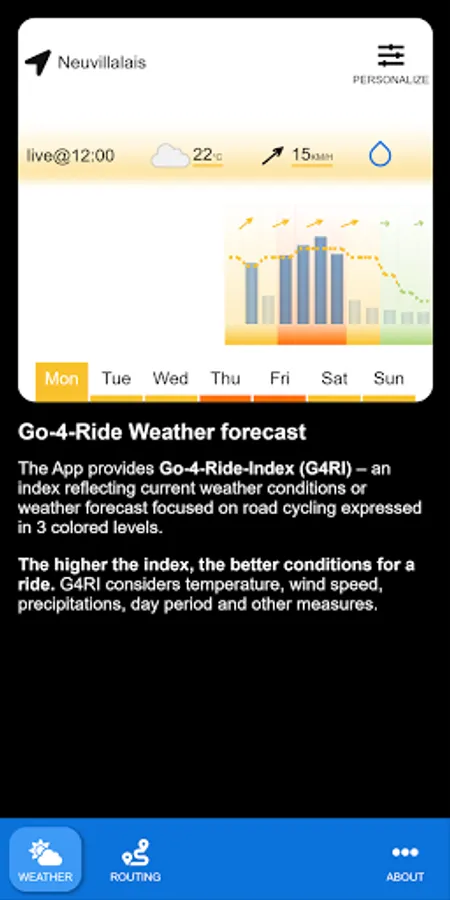 The App provides Go-4-Ride-Index (G4RI) - an index from 0 to 100 points reflecting current weather conditions or weather forecast focused on road cycling. The higher the index, the better conditions for a ride. G4RI considers temperature, wind speed, precipitations, day period and other measures.
