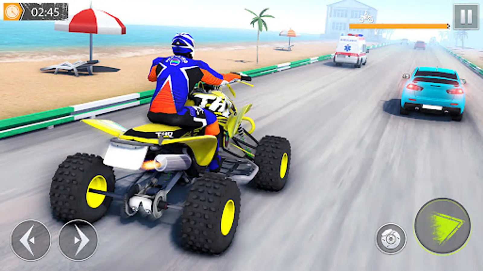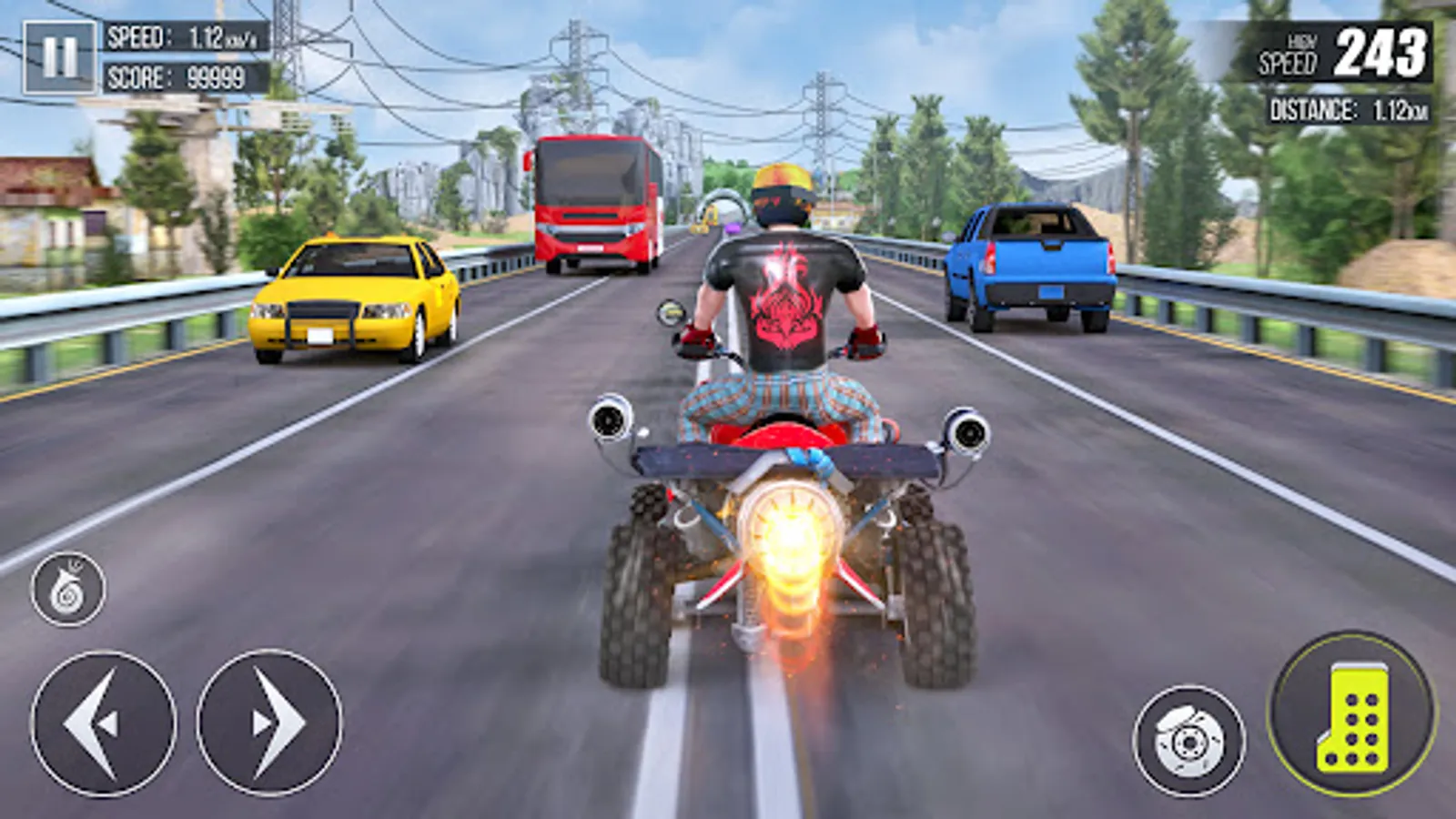 Traffic ATV rider is a highway race game. you will need to avoid all kinds of vehicles which include cars, Prado, monster trucks, and jeeps in traffic ATV rider bike game 2023. You will need to focus on road in bike stunt 3d bike racing games.