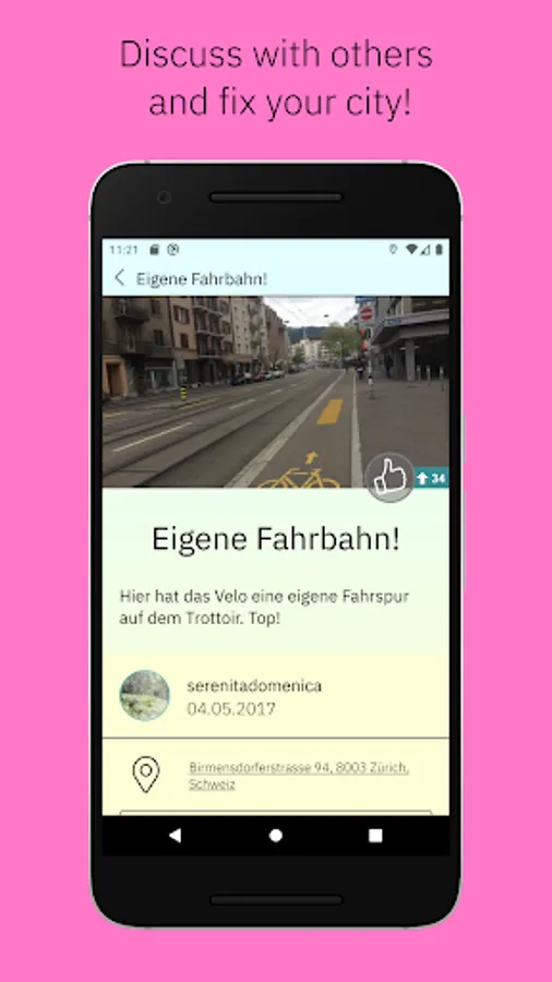 This is how it works: a user takes a photo of a place to be improved or a good example and uploads the spot with his title and comment. The spot is then displayed on the map and shown in the list. Other users can put emphasis on spots with their votes and can participate in finding solutions in the discussion. Cities, engineering companies and political interest groups as well as journalists can stay up to date about the problems and preferences of the local bike community. Small problems should be able to be fixed quickly and for the larger problems, the site serves as a digital memory so when major interventions have to be made, nothing is forgotten.