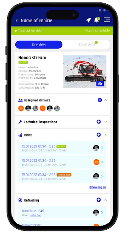 The system also allows fleet management of all types of vehicles, especially snowcats, snowmobiles and heavy equipment, including the ability to manage warehouses and fuel stations. In addition, the application includes fuel records, logbook, and service interval tracking.