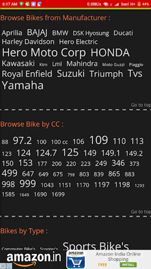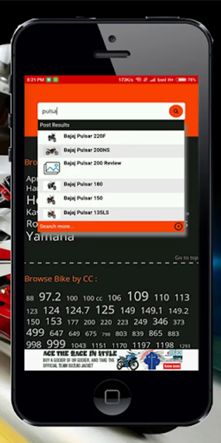 You can Search Bikes by its name, once you start typing it will suggest you with bike options. Its completely a bike search app.