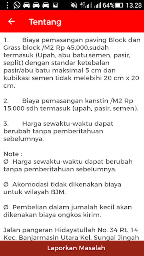 1. The cost of installing Paving Block and Grass block / M2 Rp 45,000, including (Wages, stone ash, cement, sand, sandpaper) with a standard thickness of sand / stone ash a maximum of 5 cm and cubication of cement does not exceed 20 cm x 20 cm.