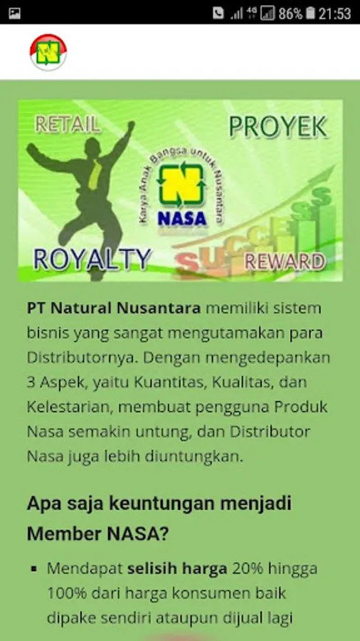 PT Natural Nusantara has a business system that prioritizes its Distributors. By prioritizing 3 aspects, namely Quantity, Quality, and Sustainability, making Nasa Product users more profitable, and Nasa Distributors also benefit more.