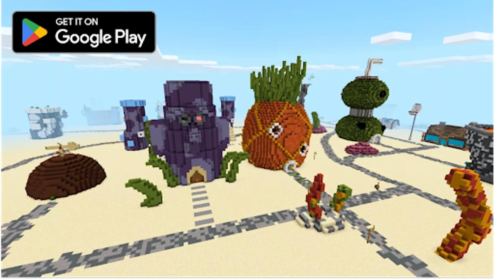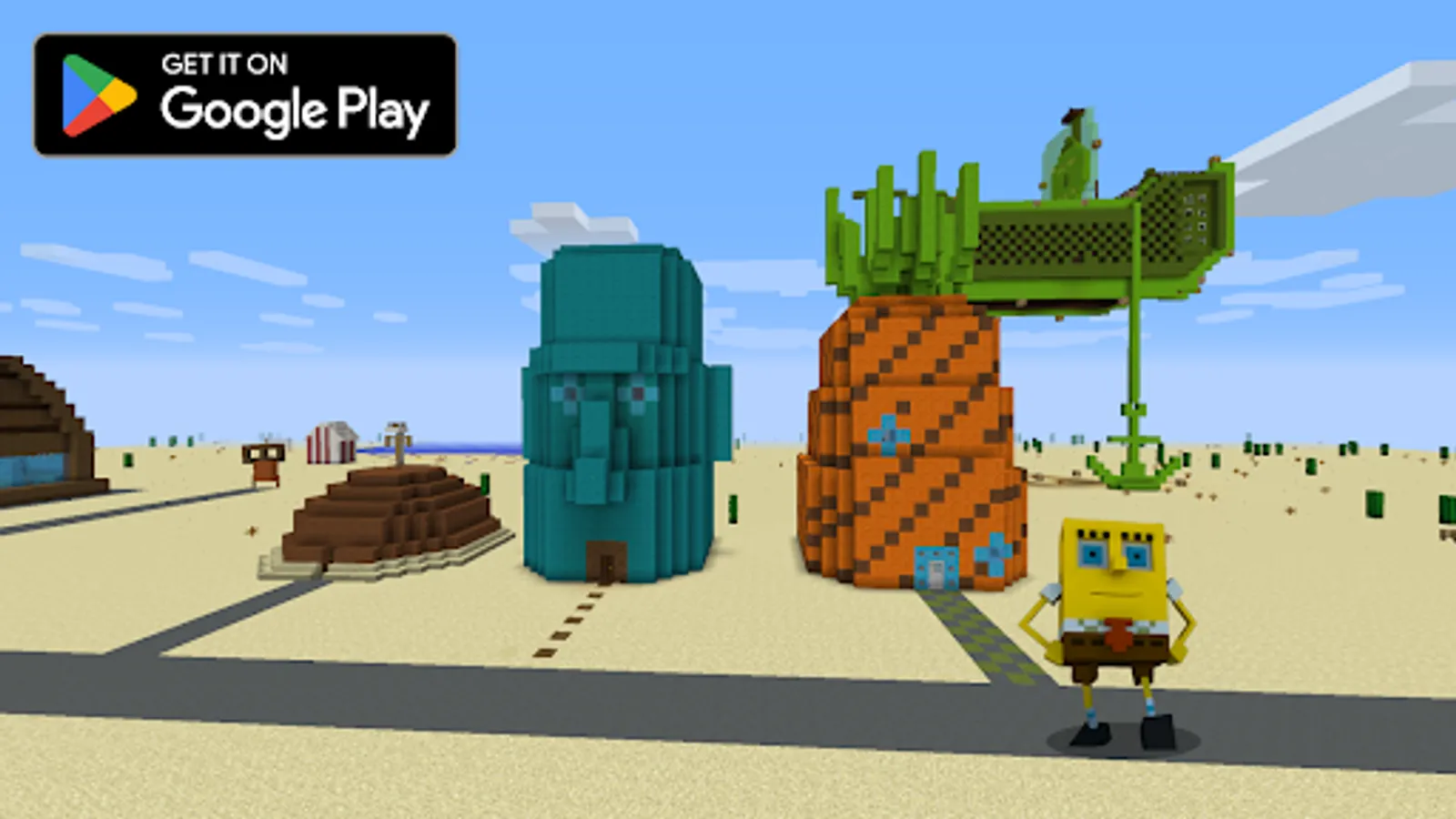 ✅ Play alone or with your friends on the Bikini Bottom map in Minecraft, visit popular places like pineapple house, Krasty Krab fast food restaurant;