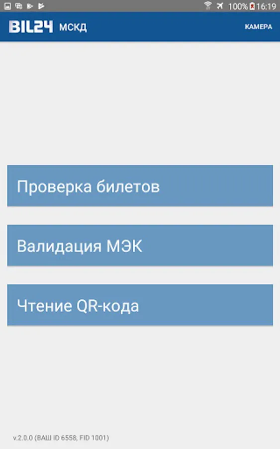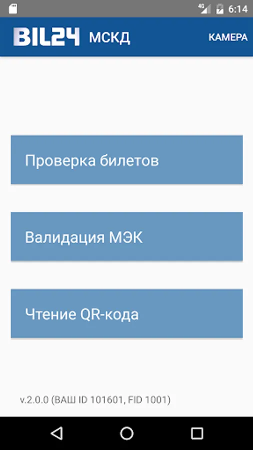 Mobile access control system (MSKD) is designed to verify the tickets sold through the ticketing platform BIL24. MSKD consists of a client-side (mobile applications) and server (BIL24 central server). The client part MSKD used at the entrance to the hall, where the presentation. MSKD can be used to control the ticket as the entrance and exit. For MSKD required camera equipped mobile device with the Android operating system version 4.0 and above, as well as Internet access. MSKD reads kriptozaschischennye mobile electronic ticketing QR-code (OIE) directly from the mobile device's screen the visitor.