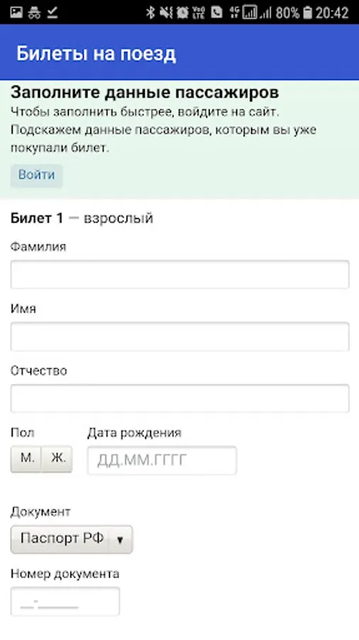 The application saves the passenger form. You can fill in the form once, and in the future information will be connected automatically when you select a ticket.