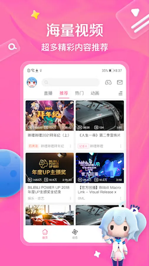 Committed to original and second-generation video sharing in the entertainment fields such as ACG and 2D, watch exciting dramas, hardcore games, film and television variety shows, digital evaluations, charming house dance, original music, fashion beauty, funny everyday, Massive content such as the development of cute pets, comics and comics, and mysterious forces such as ghost and animal training are also features of Station B!