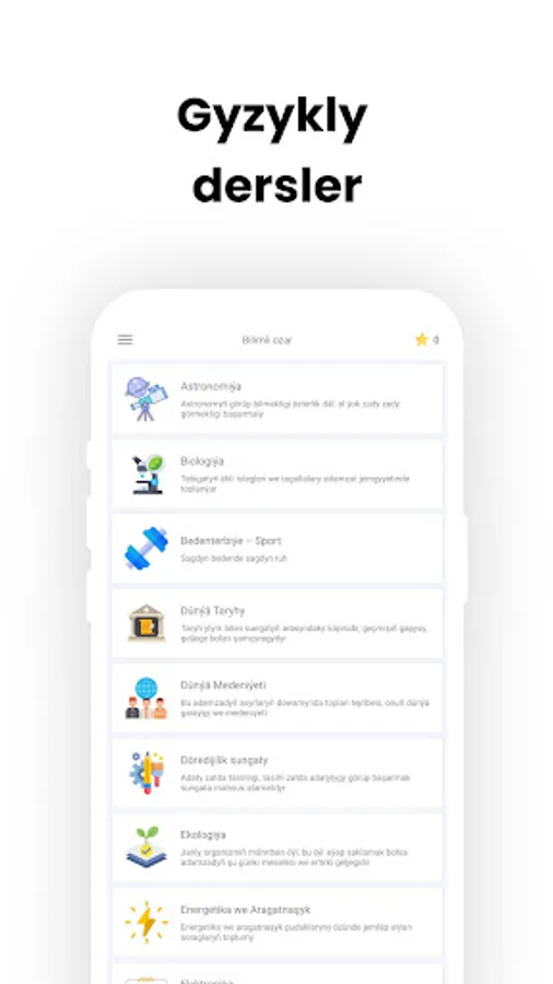 Programmada ulanyjylar özüniň höwes edýän dersleri boýunça bilim derejesini barlap, soraglara dogry ýa-da nädogry jogap berlip özleriniň netijeleri bilen tanşyp bilerler.