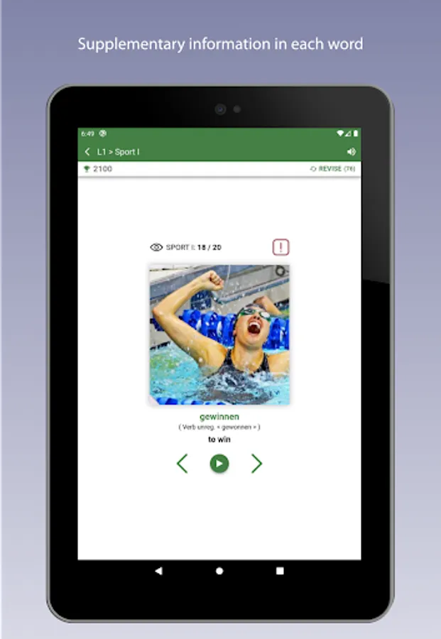 - The gender of the noun will also appear, so that you will learn directly the correct article to each noun. The plural form of each noun will also be displayed.