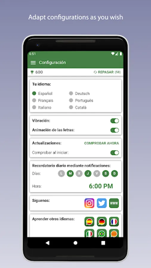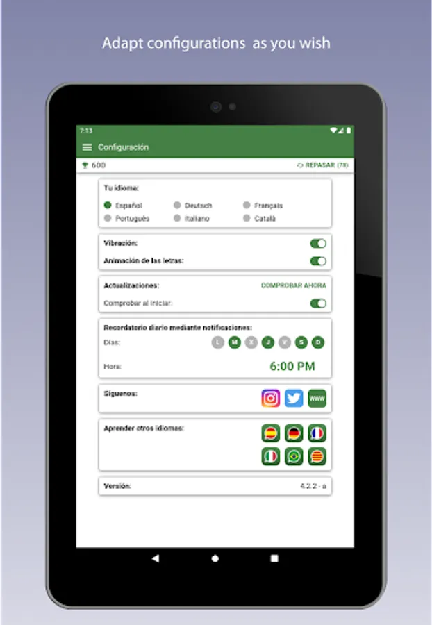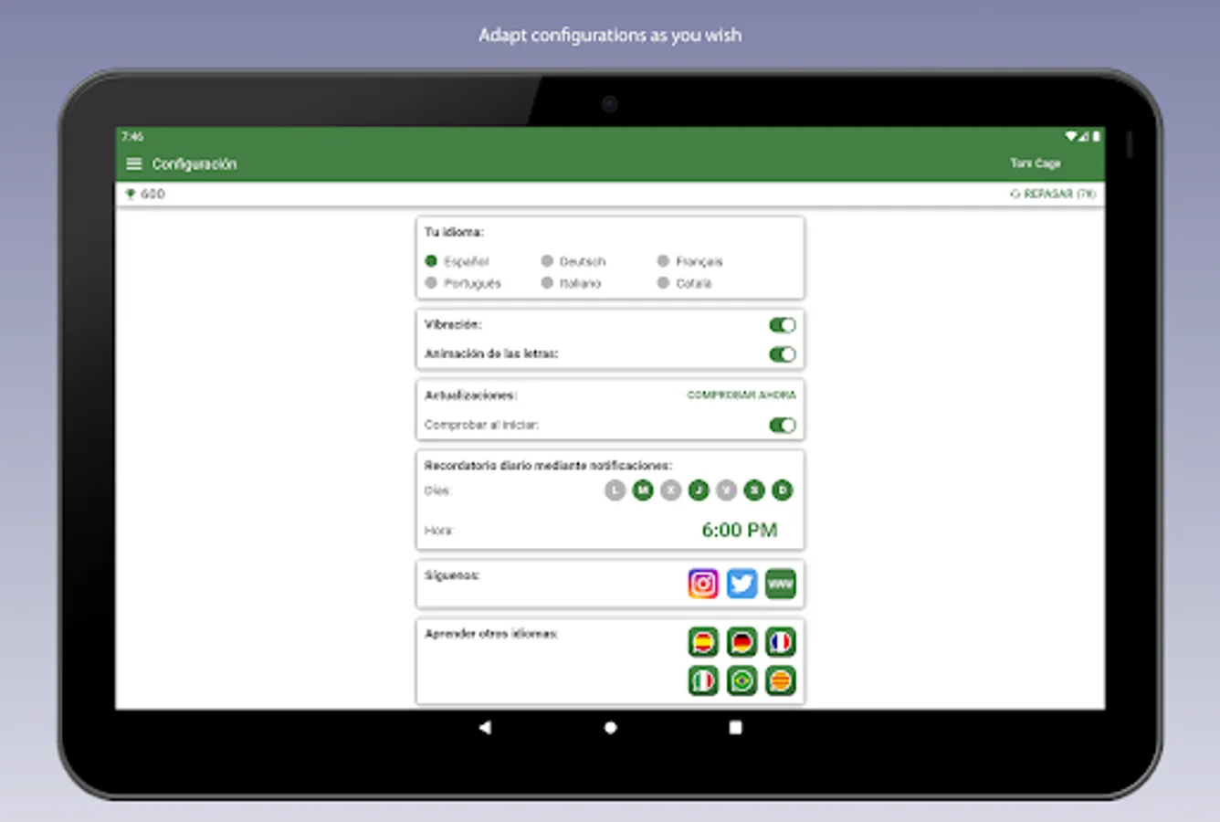 - Multi-user system: The app can be used by several users. Each user can access one’s own account with a password and have the progress saved. Perfect for families or couples who share the same device, like a tablet.