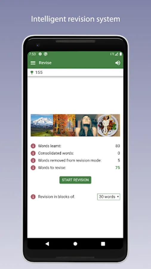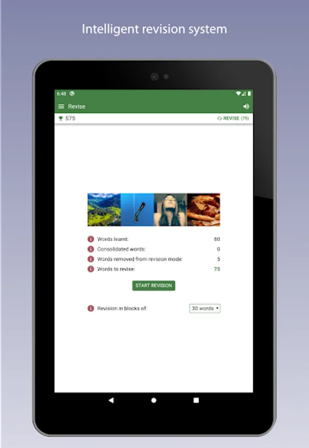 - Intelligent revision system which will make you revise the word according to your hits and mistakes. The more often you get a word wrong, the more often this word will be revised until you remember it.