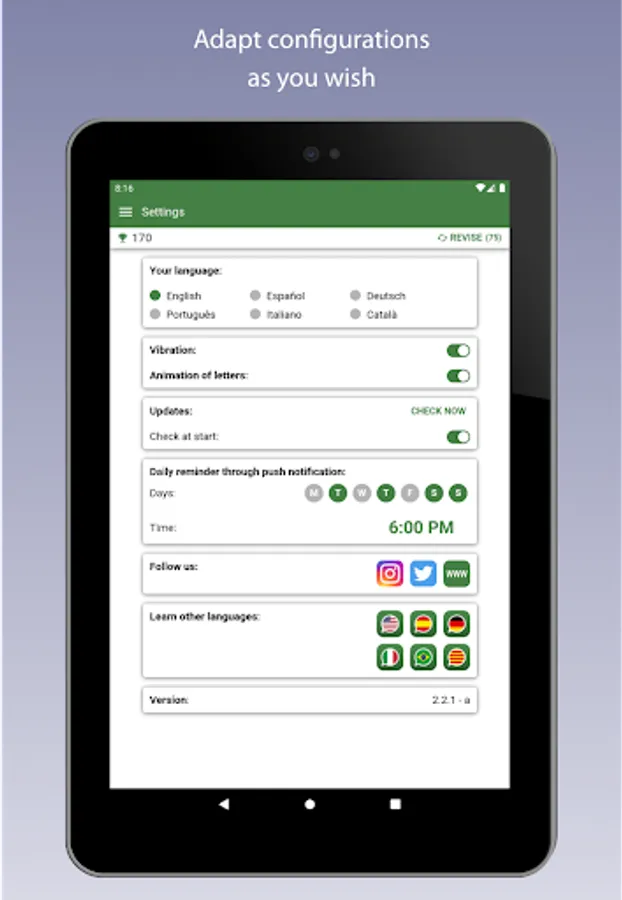 - Multi-user system: The app can be used by several users. Each user can access one’s own account with a password and have the progress saved. Perfect for families or couples who share the same device, like a tablet.