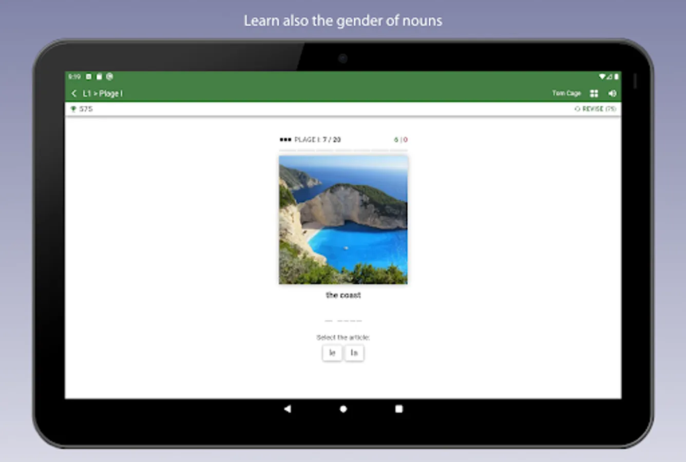 - The gender of the noun will also appear, so that you will learn directly the correct article to each noun. The plural form of each noun will also be displayed.