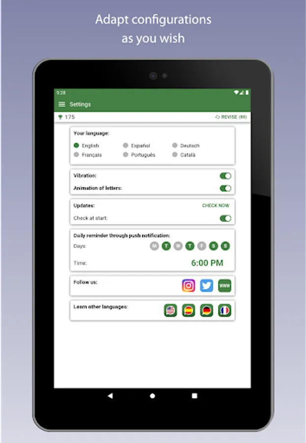 - Multi-user system: The app can be used by several users. Each user can access one’s own account with a password and have the progress saved. Perfect for families or couples who share the same device, like a tablet.