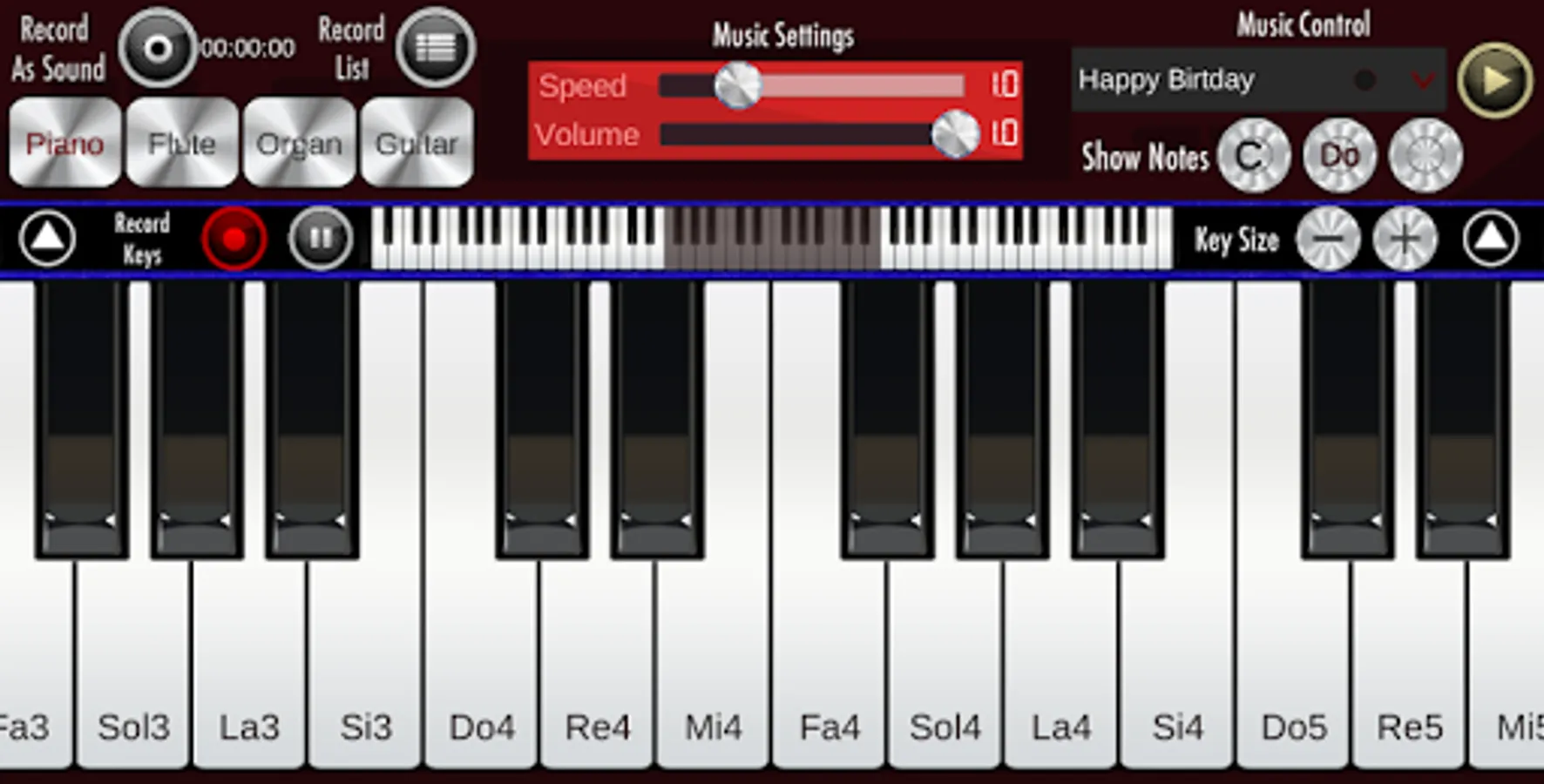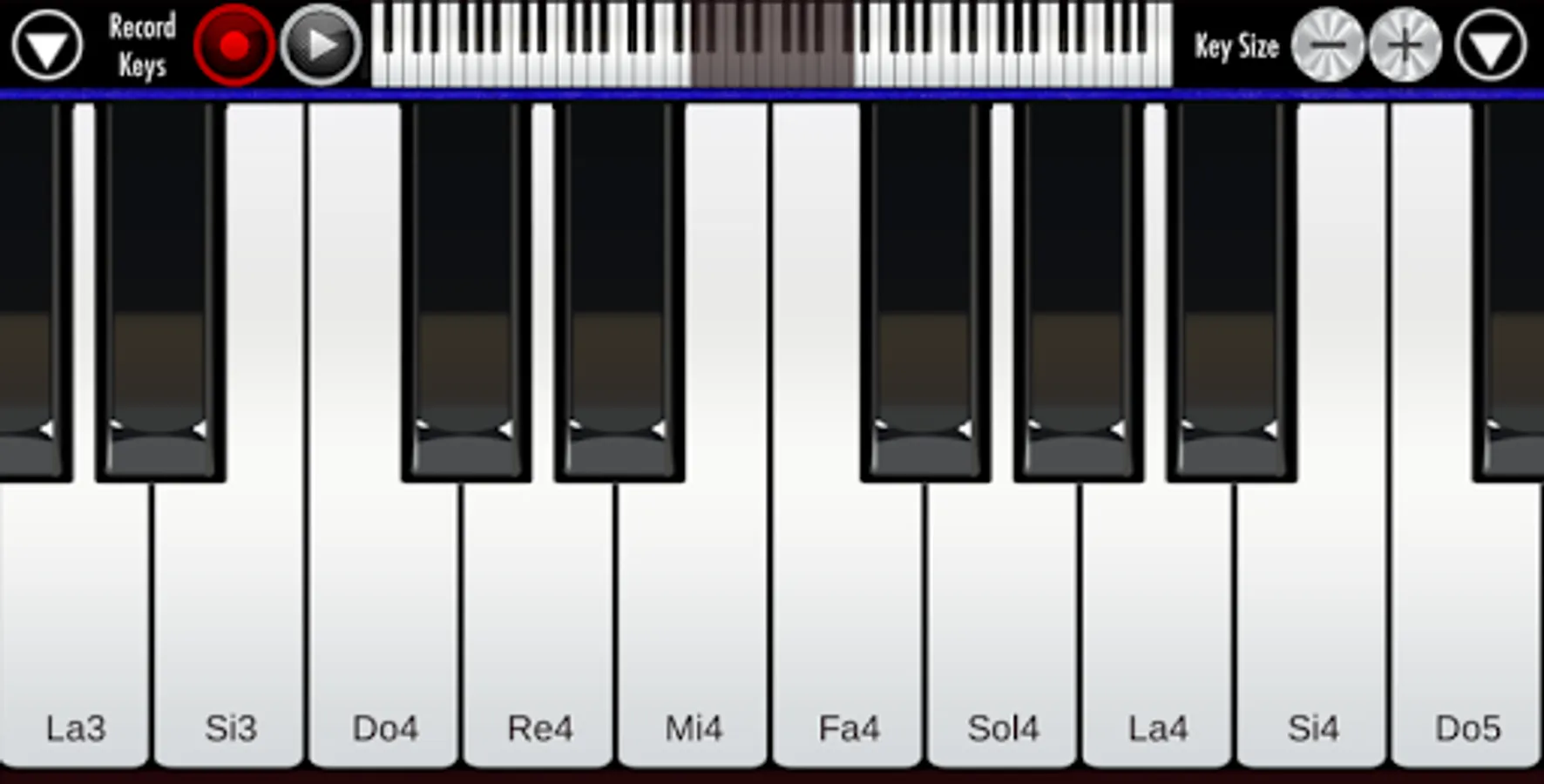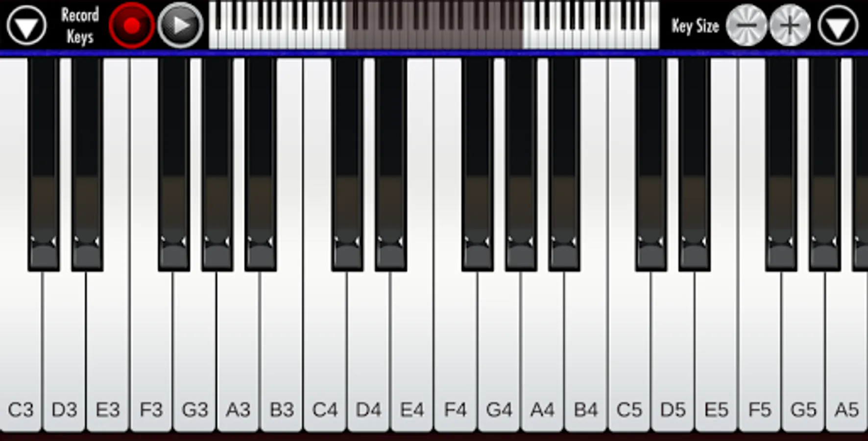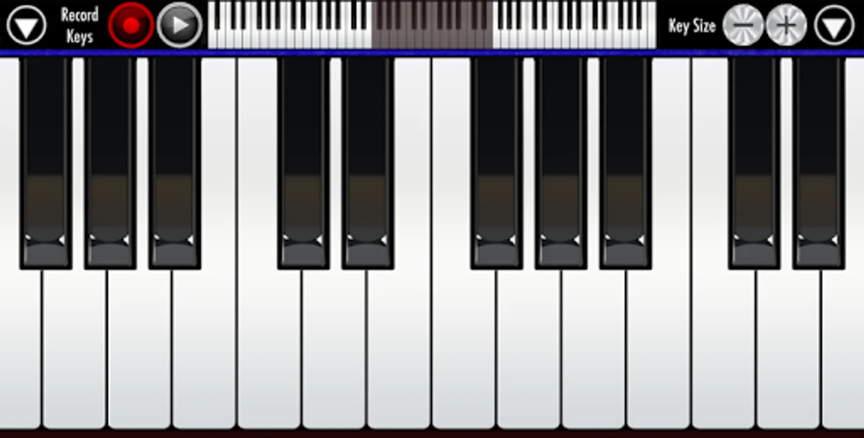 You can record while playing the piano. You can set the size of the piano with the plus and minus keys.