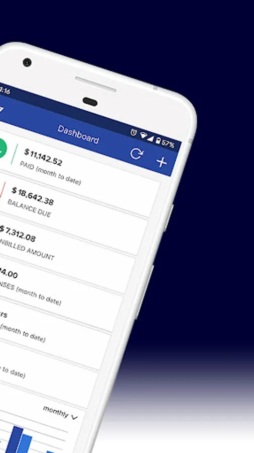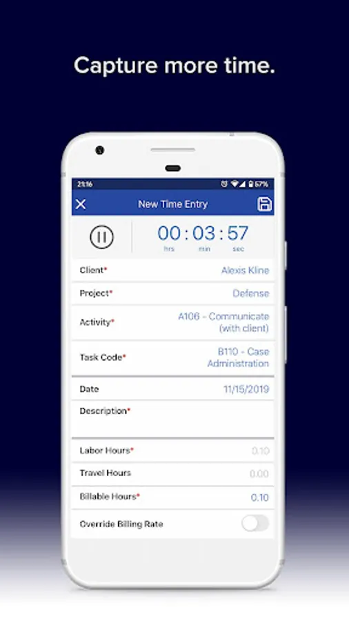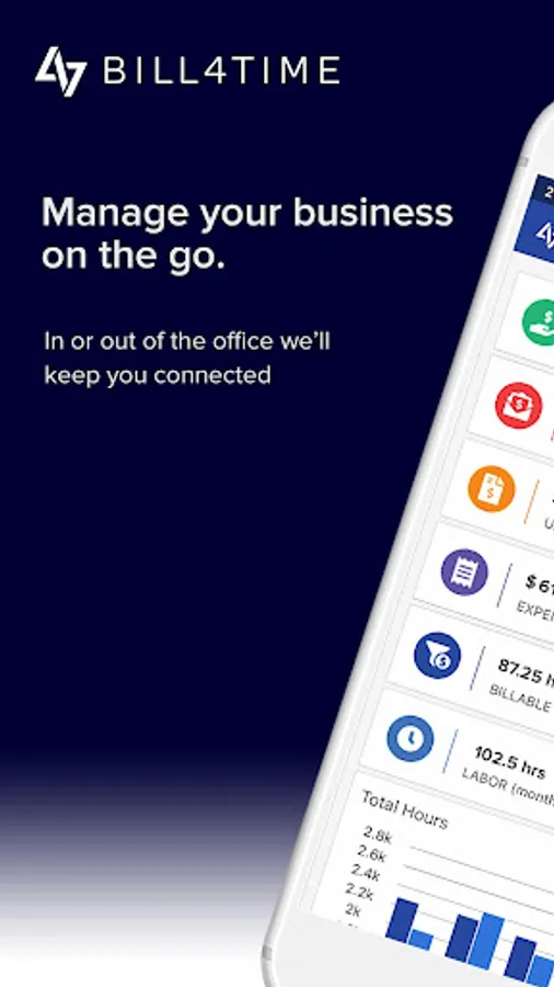 Welcome to Bill4Time's companion Android mobile app. Bill4Time’s Android app is the best in class and easiest way to track time, manage projects, and organize expenses on the go. The new dashboard summarizes and charts your billable hours and amounts to give you a quick snapshot of daily, weekly or monthly progress. Your entries will be saved if you are offline and will sync when you are back online.