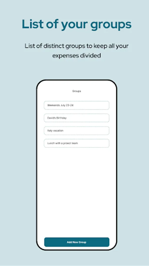 Create groups for any reason in your life: for travel, cozy evenings or lunches with colleagues, shared presents for a best friend, or to keep track of all your shared spending with an exact person.