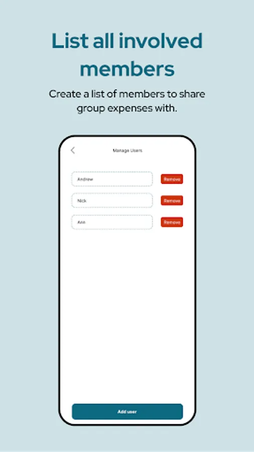 You need to create a group based on the event/expense reason and add a list of involved members to identify payment owners - and you are ready to add your shared bills.