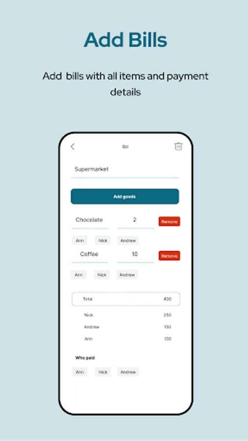 Once you start a bill creation, add all shared bill items and mark who are involved in each item of expenses and have paid that bill.