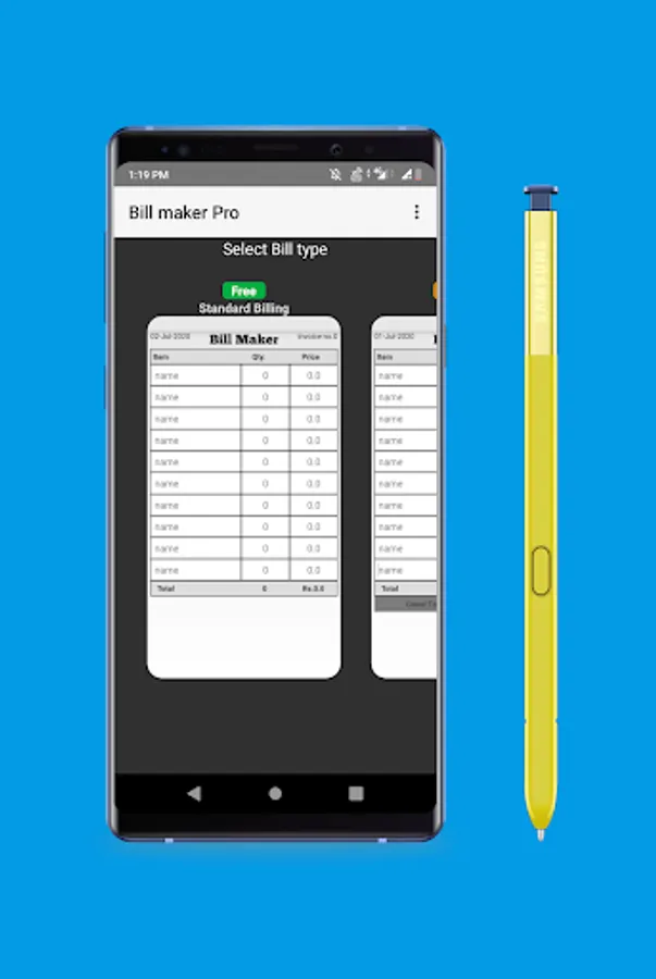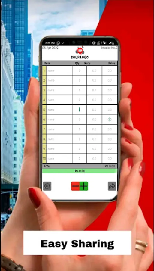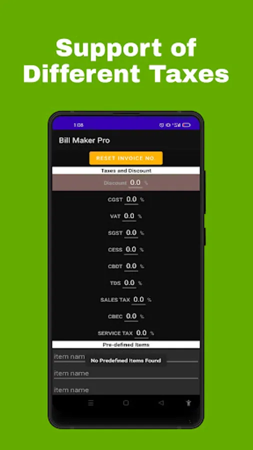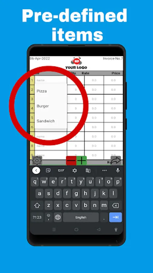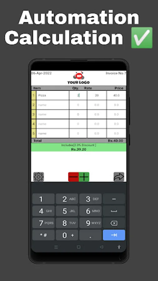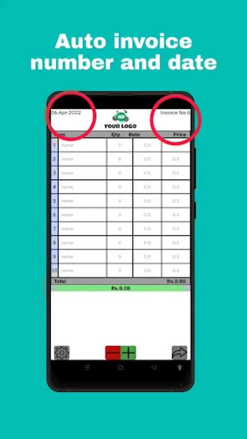Bill with own logo, Predefined Product or Item List, Auto Invoice Number, Auto Date, Direct Messenger Sharing.