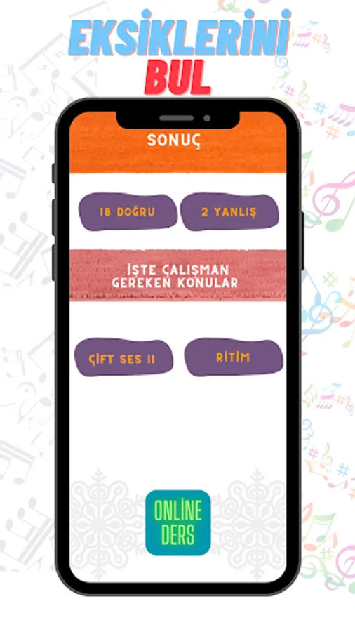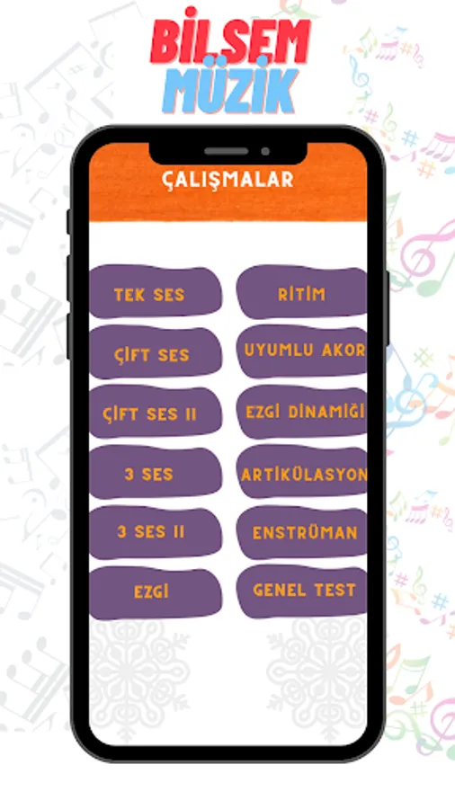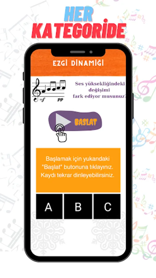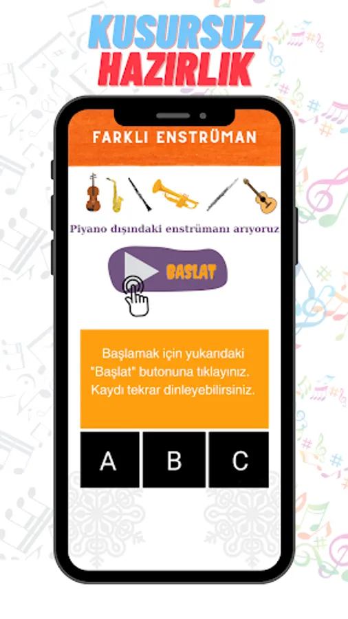 * Tek ses, Çift ses, Üç Ses, Ritim, Gürlük, Artikülasyon Farkındalığı, Çalgısal Tını Farkındalığı gibi için özenle seçilmiş yüzlerce soru.