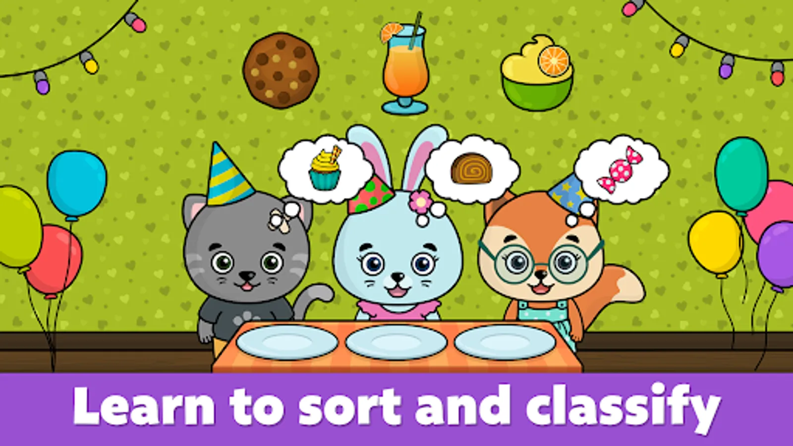 By playing these baby games kids will learn to match shapes and colors, sort and classify, recognize sizes, numbers 123 and solve puzzles. Funny birthday atmosphere will entertain your kids and bring smiles to their faces.