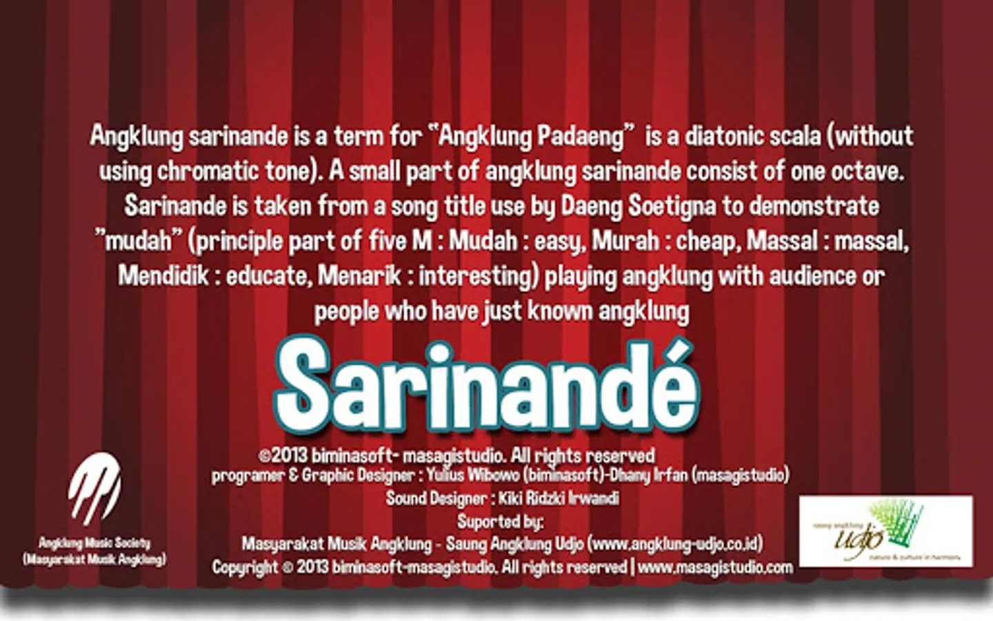 Sarinande is taken from a song title used by Daeng Soetigna to demonstrate "MUDAH" (principle part of five M:Mudah : easy, Murah : cheap, Masal : massal, Mendidik : educate, Menarik : interesting) playing Angklung with audience or people who have just known Angklung.