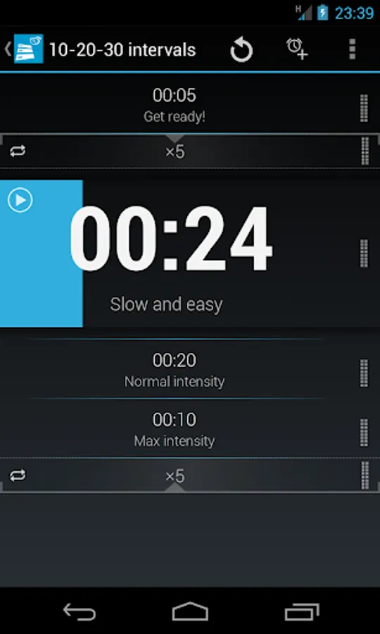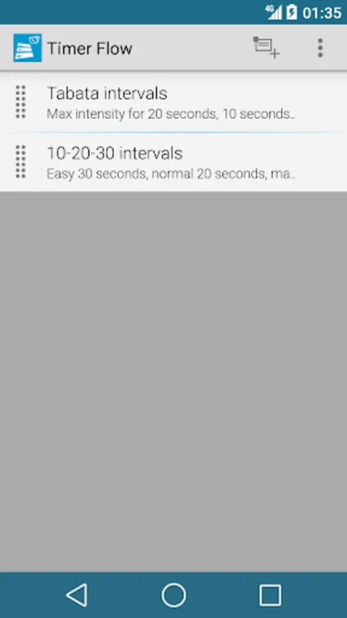 Try out the example "flows" of timers (workouts etc) or create your own flows with your lists of exercises/timers. Visual and optional audio feedback and different forms of repeats available.