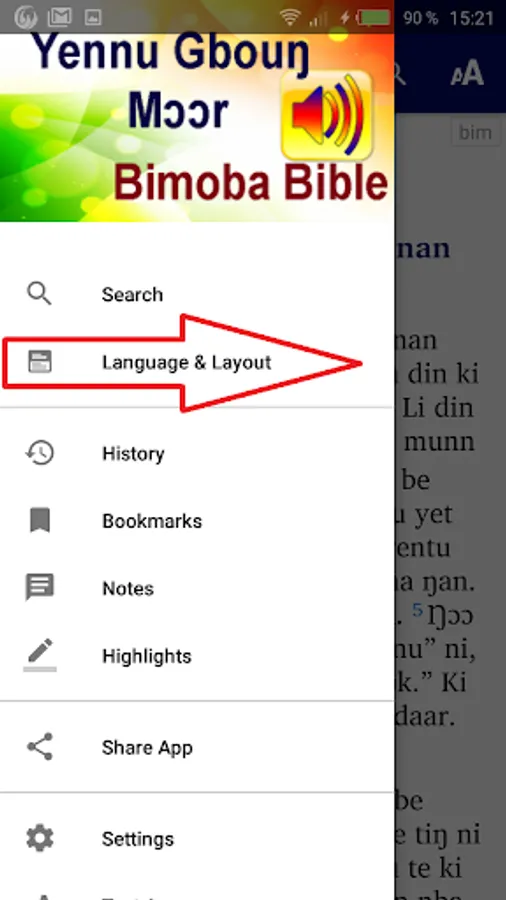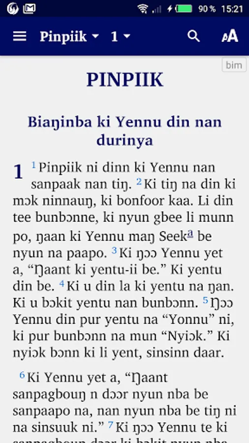 - «verset par verset» pour afficher un verset en Bimoba suivi du même verset en français ou en anglais.