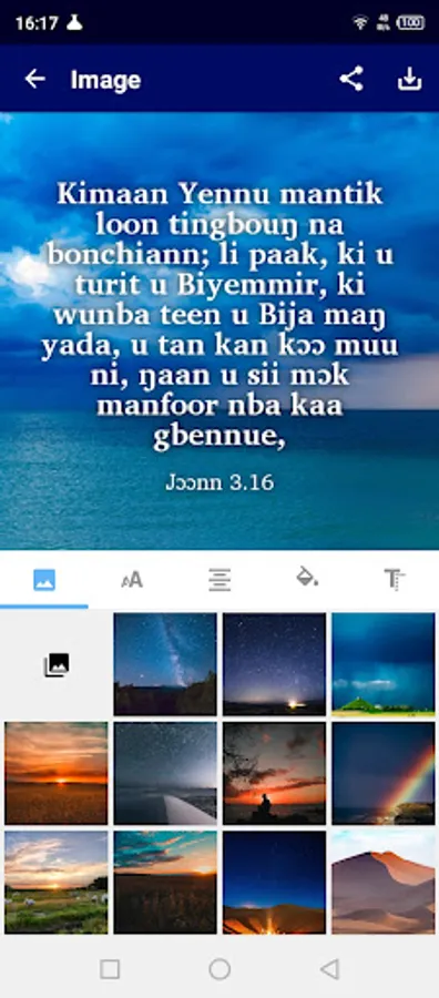 • Lorsque vous appuyez sur un verset, un bouton d'image est affiché sur la barre d'outils inférieure. Lorsque ce bouton est appuyé, l'écran apparaît. Vous pouvez choisir l'image d'arrière-plan, déplacer le texte autour de l'image, modifier la police, la taille du texte, l'alignement, le format et la couleur. L'image finale peut être enregistrée sur l'appareil et partagée avec d'autres.