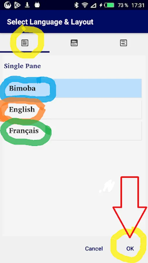 - «deux volets» pour afficher le Bimoba en haut et parallèlement la version française ou anglaise en bas