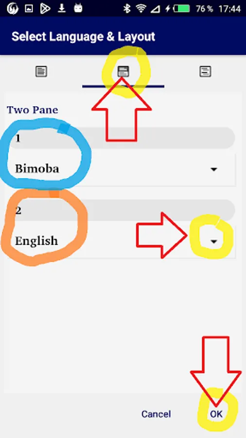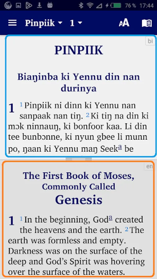 - "two panes" to display the Bimoba at the top and the English or the French version at the bottom